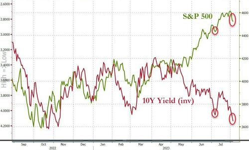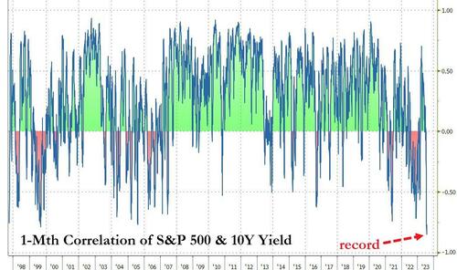 Zerohedge注意到,美债收益率和标普500指数之间的负相关性目前正处于极端状态: