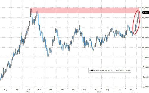 从上周五日本央行对YCC政策的“松绑”、到本周美国经济继续表现出的超乎寻常韧性(小非农ADP远超预期),再到美国庞大预算赤字引发的发债海啸担忧,这一切都推动着长期美债收益率一路扶摇直上……