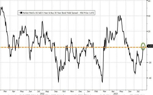 此外,经通胀调整的收益率曲线和名义收益率曲线开始急剧陡峭,因为面对可能更具挑战性的财政前景,投资者要求较长期国债提供更高的风险溢价。最具标志性的一处变化是,5年期和30年期美债收益率在周四已经结束了倒挂!