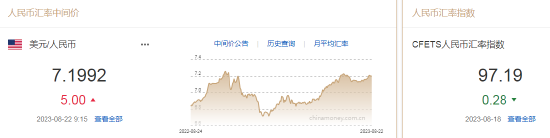 8月22日,人民币中间价报7.1992,下调5点,上一交易日中间价报7.1987,在岸人民币上一交易日收报7.3139。