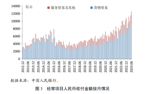 8月17日,中国人民银行发布《2023年第二季度中国货币政策执行报告》称,人民币国际化稳步推进。人民币在跨境贸易投资中使用增多。上半年,跨境人民币收付金额合计24.5万亿元,同比增长20%,在同期本外币跨境收付总额中占比达57%。其中实收12.0万亿元,实付12.4万亿元。经常项目下跨境人民币收付金额合计6.3万亿元,同比增长37%,其中,货物贸易收付金额4.8万亿元,服务贸易及其他经常项目下收付金额1.5万亿元;资本项目下人民币收付金额合计18.2万亿元,同比增长15%。上半年货物贸易、直接投资项下人民币跨境收付金额占同期本外币跨境收付比重分别为23%和70%,同比分别提高6.7个和6.6个百分点,为近年来最高水平。