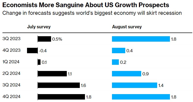 最近的反通货膨胀趋势预计将持续下去。剔除食品和能源后,经济学家目前认为,到今年年底,核心个人消费支出(PCE)价格指数的降温速度将高于7月份的预测。他们对整体PCE物价指数指标的估计——这是美联储偏爱的通胀目标——几乎没有变化。即便如此,他们认为CPI的涨幅高于此前的预期。与此同时,到明年年底的失业率预期明显下降,招聘人数预计会增加,这也有利于经济软着陆。