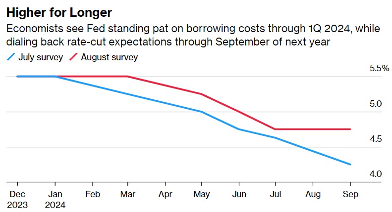 接受彭博调查的经济学家目前预计,美联储将在更长时间内维持高利率,因为经济走强可能会使通胀高于美联储的目标。虽然经济学家认为近期不会进一步加息,但他们也预计美联储在明年第二季度之前不会降息——这比7月份的预测晚了三个月。