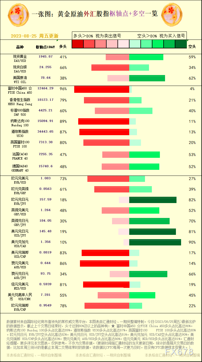 汇通财经APP讯——一张图:黄金原油外汇股指“枢纽点+多空占比”一览。今日(2023/08/25周五)最新出炉的数据显示,截止上个交易日结束时,头寸达到80%及以上的品种有:★ 富时中国A50 ☆FTSE China A50多头占比高达96%。纳斯达克100 Nasdaq 100多头占比高达89%。道琼斯指数 US30多头占比高达87%。英国富时100FTSE 100多头占比高达80%。欧元兑日元 EUR/JPY空头占比高达82%。美元兑日元 USD/JPY空头占比高达81%。美元兑加元 USD/CAD空头占比高达90%。美元兑瑞郎 USD/CHF多头占比高达83%。澳元兑美元 AUD/USD多头占比高达86%。纽元兑美元 NZD/USD多头占比高达81%。汇通财经提醒,更多详见本文图表。仅供参考,不作为交易依据。