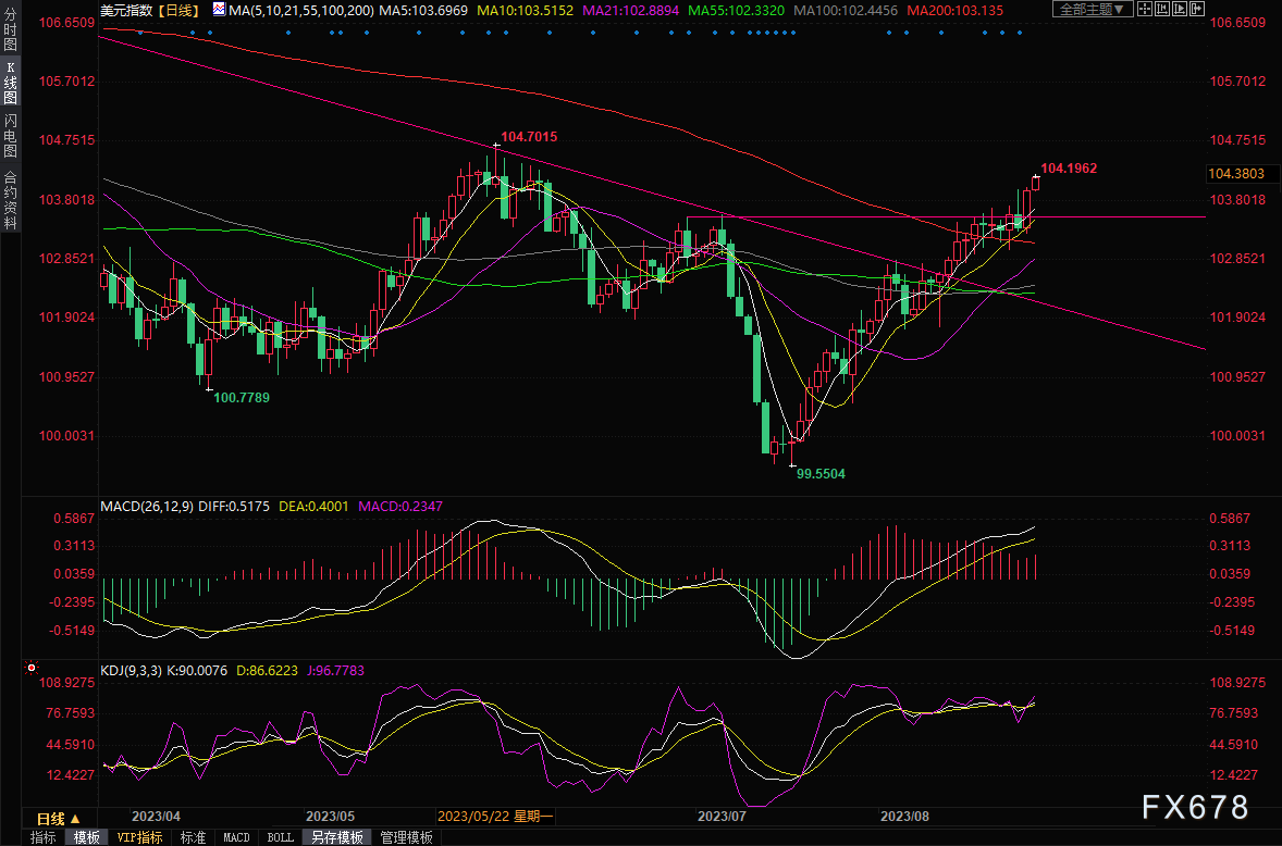 周四美元指数收涨0.59%,为近一个月最大单日涨幅,收报103.98附近;周五亚市,美元指数继续冲高,截止10:13,最高触及104.20,为6月7日以来新高。