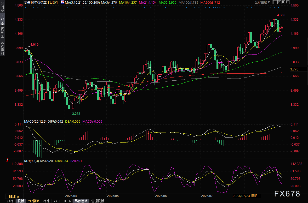 经济状况表明,美联储可能需要在货币政策上采取更多行动,而抑制经济活动的长期借贷成本急升则为联储减轻了一些压力。自2023年初维持在3.84%左右的水平以来,关键的10年期美国国债收益率一路攀升,虽然走势震荡,但自7月中旬以来涨幅明显,周四下午稍早报约4.23%。