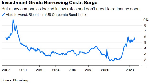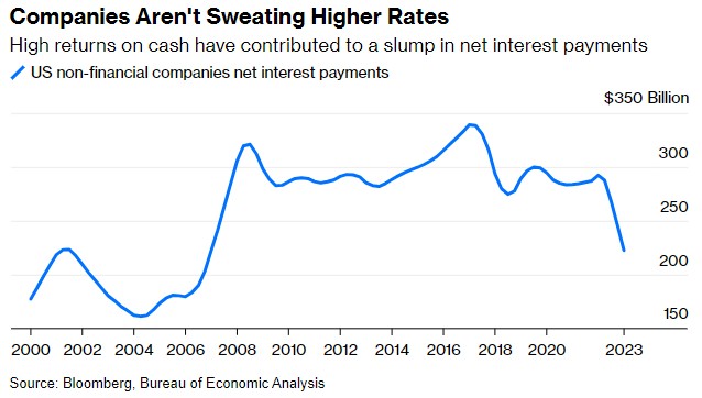 仅仅把现金存在银行就能赚到这么多钱,这可能会阻止公司进行资本支出或回购股票。随着企业耗尽现金储蓄或以高得多的利率为债务再融资,净利息支出将上升。