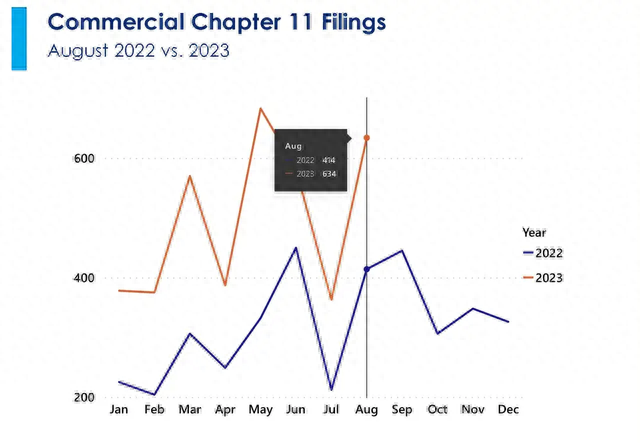 Epiq Bankruptcy的数据显示,今年8月,美国共有634份破产申请。与12个月前的411份申请相比,这一数字增长了约54%。