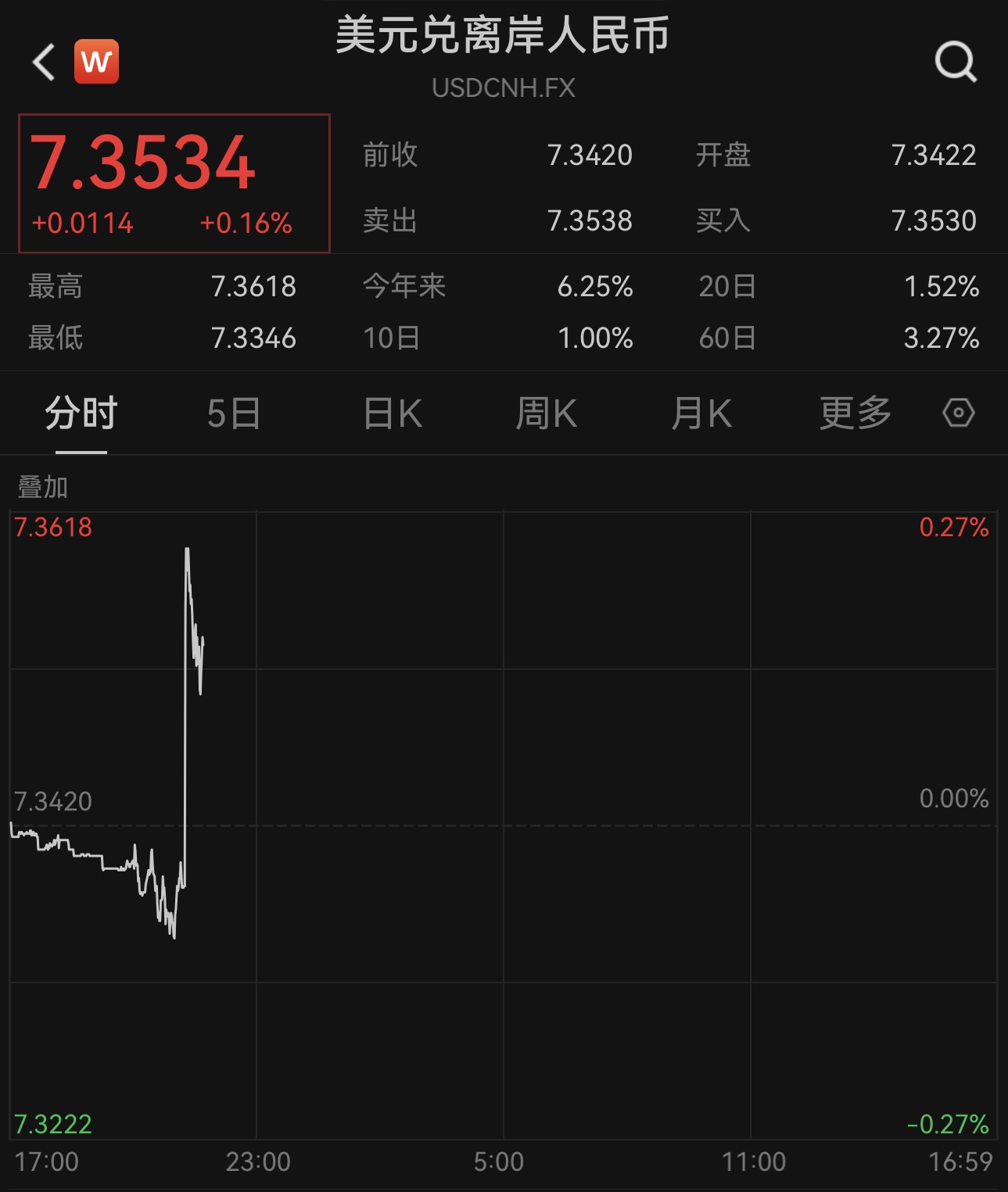 更多反映国际投资者预期的离岸人民币对美元汇率则接连跌破7.35和7.36关口,盘中最低跌至7.3618,创下去年11月初的新低。随后,离岸人民币对美元汇率跌幅有所收窄。