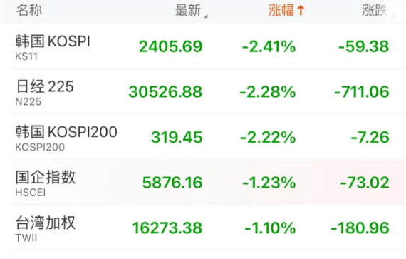周三亚太股指集体大跌,日经225指数跌2%,韩国KOSPI指数跌2.41%,澳大利亚S&P/ASX200指数跌0.77%,我国台湾加权指数跌1.1%。