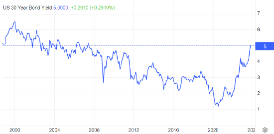【xm外汇】美国30年期国债收益率触及5.0% 为2007年来最高水平