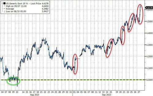 随着油价大涨令市场交易员愈发忧心于美国通胀反弹的前景,美国国债市场周三进一步遭遇了大举抛售,有着“全球资产定价之锚”之称的10年期美债收益率一举升破了4.6%关口。而与此同时,美元指数已连续第六个交易日出现攀升,美国股市则在隔夜整体涨跌不一。