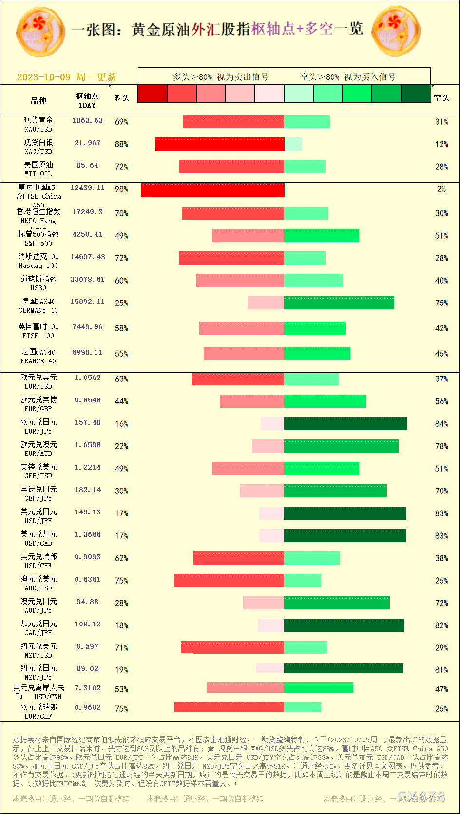 汇通财经APP讯——一张图:黄金原油外汇股指“枢纽点+多空占比”一览。今日(2023/10/09周一)最新出炉的数据显示,截止上个交易日结束时,头寸达到80%及以上的品种有:★ 现货白银 XAG/USD多头占比高达88%。富时中国A50 ☆FTSE China A50多头占比高达98%。欧元兑日元 EUR/JPY空头占比高达84%。美元兑日元 USD/JPY空头占比高达83%。美元兑加元 USD/CAD空头占比高达83%。加元兑日元 CAD/JPY空头占比高达82%。纽元兑日元 NZD/JPY空头占比高达81%。汇通财经提醒,更多详见本文图表。仅供参考,不作为交易依据。