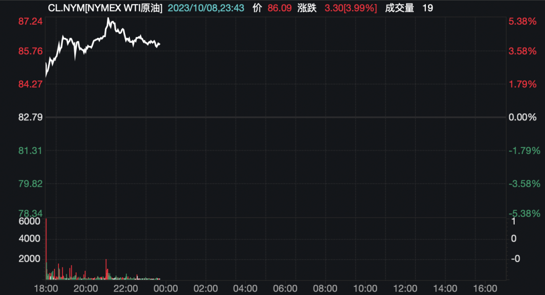 受中东局势紧张刺激,国际油价大幅上涨。截至发稿,WTI原油期货日内最高涨超5%,现报86.15美元/桶。布伦特原油日内也一度涨超5%,现报87.74美元/桶。