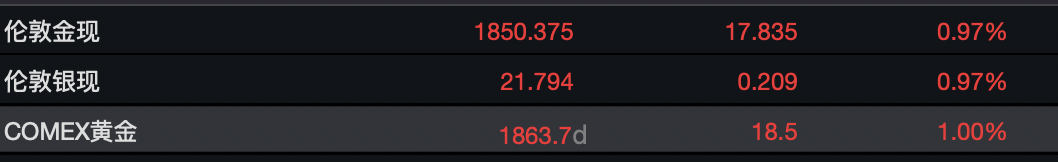除了原油外,国际市场上,黄金也出现一定程度上涨。伦敦金现一度涨超过1%,现报1850.375美元/盎司,COMEX黄金最高涨1.32%至1869.5美元/盎司,截至发稿涨1%报1863.7美元/盎司。