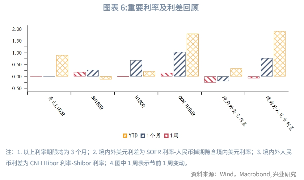 美元流动性方面,9月25日至9月28日当周,境内掉期隐含美元利率上行,美元SOFR、Libor利率震荡,境内外美元利差(境外-境内)收窄。中秋和国庆假期内,离岸美元利率略微走高。