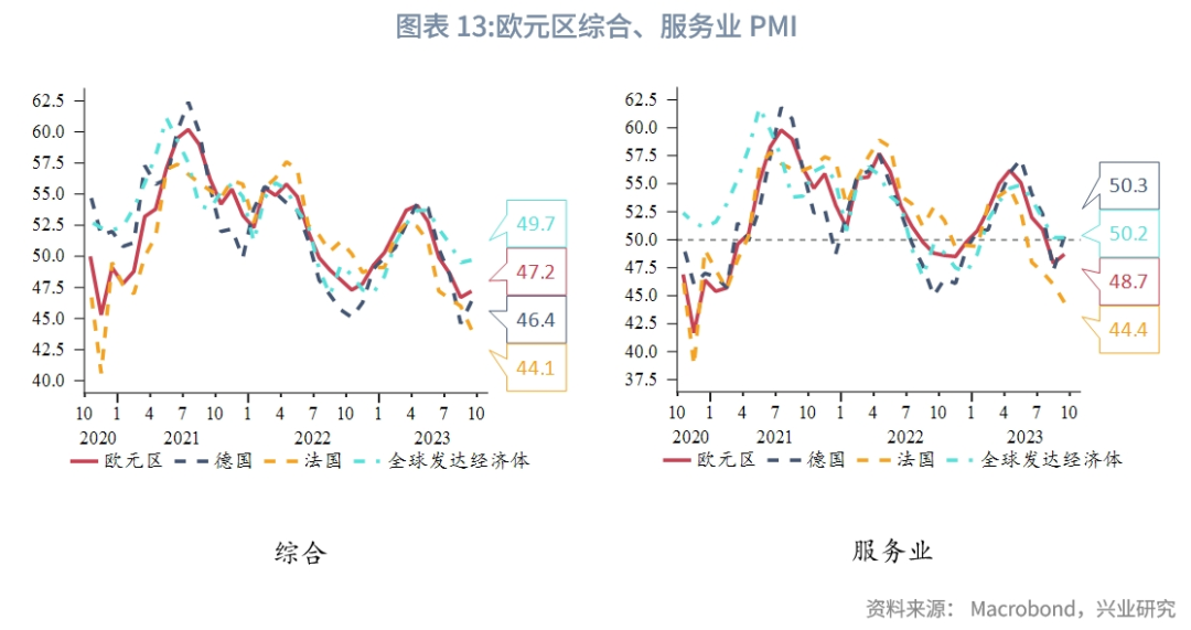 10月4日,标普环球公布的欧元区9月综合PMI终值为47.2,略高于预期值47.1和8月的46.7。尽管该数据已经连续第四个月低于荣枯线,但最新值表明欧元区私营部门商业活动收缩的速度轻微放缓。主要成员国中,德国9月综合PMI从8月的44.6升至46.4,同样略高于预期的46.2;法国9月综合PMI终值为44.1,低于8月的46.0,但高于最初估计的43.5。
