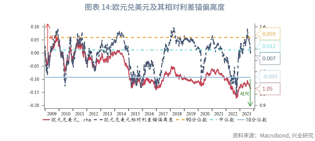 除了就业数据的扰动外,本周美元指数的回调也存在技术层面的原因。周二美元指数触及了7月以来上行通道的上轨线。这也就意味着美元指数涨势受到的基本面支撑未变,非美货币的喘息窗口有限。短期内,欧元兑美元来到前期密集成交区,将获得一定支撑。但在欧元区疲弱基本面、欧央行暂停加息的立场之下,欧元兑美元下行仍有空间、美元指数料继续升值。当前欧元兑美元相对利差锚的偏离度指标已至中性下方区域,修复高估之旅已完成,但欧元兑美元的回落不会因此而止步,将继续向超卖方向运行。