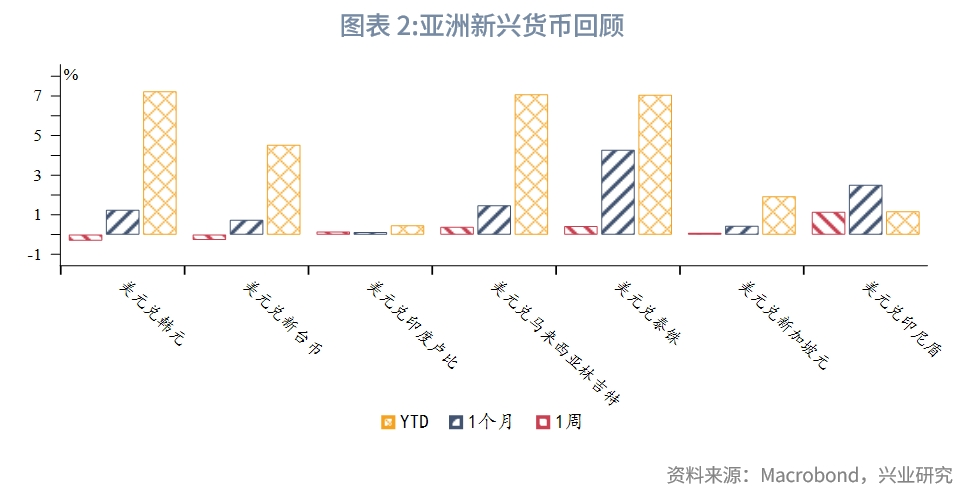 亚洲汇率方面,新兴市场货币相对美元走势分化。印尼央行连续第八个月维持政策利率不变,印尼盾相对美元贬值幅度较大。
