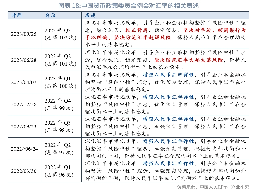 关于汇率的描述调整为“深化汇率市场化改革,引导企业和金融机构坚持‘风险中性’理念,综合施策、校正背离、稳定预期,坚决对单边、顺周期行为予以纠偏,坚决防范汇率超调风险,保持人民币汇率在合理均衡水平上的基本稳定”,较此前例会表述新增了“校正背离”“坚决对单边、顺周期行为予以纠偏”的字段,体现了央行对人民币汇率预期的政策信心和管理决心。