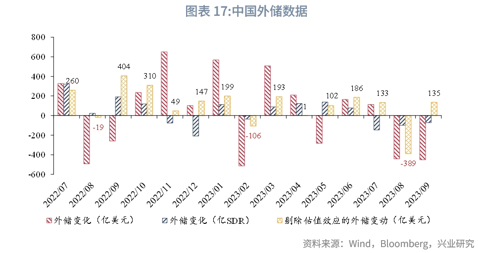 2023年9月,美元汇率和利率上行均贡献负向估值,剔除估值效应后,外储实际增加135亿美元。