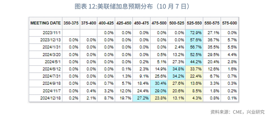 美国9月非农报告体现出就业增长强劲,这表明在高利率、大罢工和政府可能关门的几大不利影响下,美国经济仍运行良好。不过,鉴于时薪不及预期,美联储进一步加息的必要性降低。数据公布后,市场反应波动。根据芝商所(CME)追踪的数据,联邦基金期货市场的交易员们预计年底前美联储加息的可能性上升至45%附近后回落。美元指数、美债10Y收益率飙升后反转。