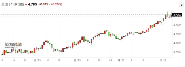 风险资产的下挫都与一个因素息息相关——美债收益率持续飙升。10年期美债收益率在国庆中秋“双节”期间上行19BP至4.78%,30年期美债收益率上行24BP至4.95%。美国经济衰退预期大降温、加息预期重燃以及美国债务供给不断攀升是主因。多家接受记者采访的海外机构都提及,在过去的50年中,10年期美债收益率在大部分时间内都要高于当前的4.8%,换言之,过去十几年的低利率只是特殊现象,要为5%以上的收益率新常态做好准备。