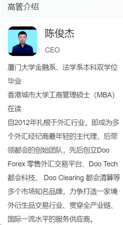 Doo Prime 德璞资本老板陈俊杰,1993年8月9日出生,深圳市宝安人,目前是在逃人员(编号T53030017***1020),在2015年开始先后成立深圳前海中金都会科技有限公司、深圳前海中金都会科技有限公司上海分公司并担任法人,开发Doo Yesun Cloud 易盛云交易系统、Doo Trader 交易云系统、MT4客户云管理系统等外汇交易、代理管理系统,先后搭建过二元期权,外汇白标,都是国内明令禁止的行业,由于其搭建的盘子先后出事,在2017年6月39日被云南省曲靖市警方立案,后来在国内混不下去,才去外面操盘整个Doo Prime 德璞资本,国内应该是回不来了。