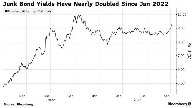 这一险恶环境已导致彭博全球高收益指数的平均收益率在本周升至9.26%,创下去年11月以来的新高,几乎是2022年初的两倍。