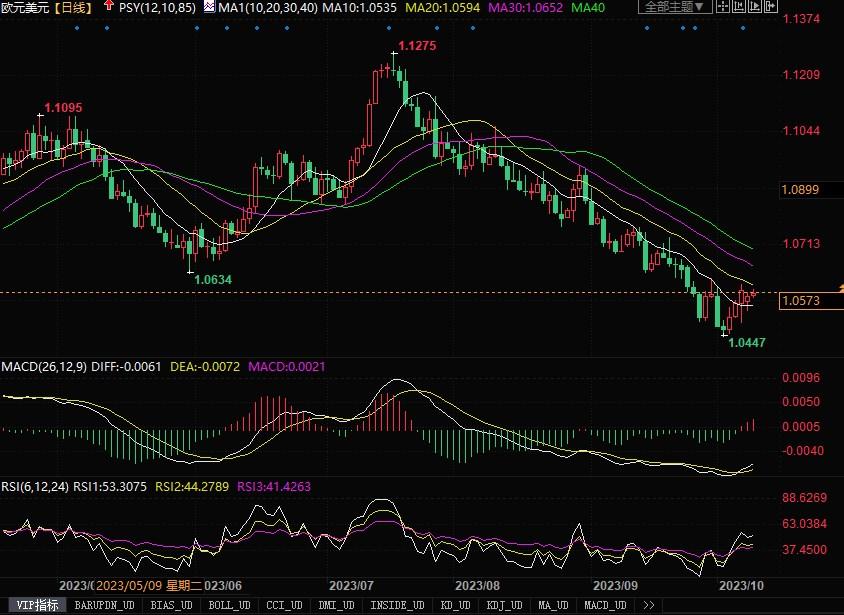 周一(10月9日),欧元兑美元略保住了近期的反弹回升势头,收盘于1.0565,当日略涨0.09%。虽然周一的外汇市场上,巴以冲突仍在继续中,但避险买盘未能给到美元太大的刺激抬捧。这主要是,自上周五美国公布非农数据后,根据芝商所的数据,投资者预计美联储不会在11月再次加息。期货走势也显示,市场预计美联储决策者在11月政策会议上维持利率不变的可能性为88.5%。美联储利率调整的前进步伐有望缓下来,暂时也是给到其他非美货币喘息的机会。但是,周一当日的数据显示,德国8月份工业生产环比下降0.2%,降幅略高于预期,这再次引发了对欧元区经济衰退的担忧。为此,欧元近几个交易日形成的反弹势能也遭到一定的平抑。日线图上,欧元/美元仍处在布林带通道中轨线之下,各类技术指标有拐头迹象,显示欧元经过前期的沉重抛压之后,有进入反弹调整的交易节奏迹象。目前上方1.0600附近构成初步的阻力所在,若能冲破,有望在反弹的节奏带动下,走高一线。相反若遇阻上述阻力水平,恐仍存在回低的风险。