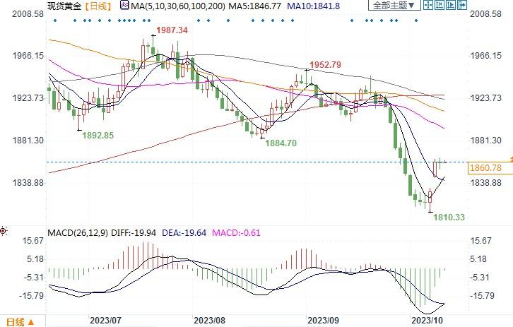 现货黄金日线图北京时间10月11日11:57现货黄金 报 1860.08 美元/盎司