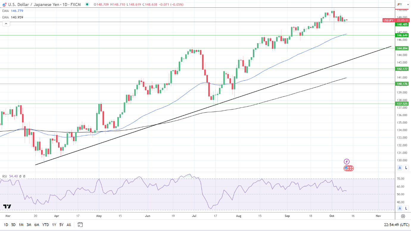 周三(10月11日)亚市,美元/日元在148.70维持横摆走势,以巴冲突紧张局势增加了对日元的需求,但国际货币基金组织(IMF)警告,全球复苏依然缓慢,日本2024年国内生产总值(GDP)增长展望为1%,低于发达经济体预计的1.4%。美国加息前景、油价飙升和日本大型制造商士气低迷,3大利空联袂压制日元走势,疲弱的数据可能迫使日本央行维持负利率的超宽松政策。