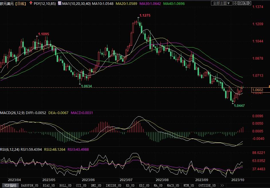 周二(10月10日),欧元兑美元升0.32%,报1.06美元;衡量美元兑其他六种货币的美元指数=USD下滑约0.15%,报105.79,远低于上周创下的11个月高点107.34。亚特兰大联储总裁博斯蒂克最新发表言论表示美联储无需进一步加息。博斯蒂克对美国银行业协会表示,美联储的政策已经具有足够限制性,他还认为未来不会出现衰退,美联储加息会导致经济放缓和通胀下降。这番评论部分是在回应以色列-加沙冲突事件时作出的。中东流血冲突持续不断以及美联储官员的鸽派言论大大拖低了美国公债收益率。周二当天指标10年期公债收益率从周一的高点4.887%跌至4.618%的日内低点。市场上似乎开始充斥着美联储将会停止加息周期的预期。在这种市场氛围下,欧元/美元也是借机继续延续着近期得反弹走势。日线图上,汇价已上穿了布林带通道中轨线,技术指标开始上扬,显示欧元反弹势能在逐渐聚拢。但本周由于有美国通胀数据公布,因此欧元得多头交易预料还会显得谨慎。上方主要留意强阻力水平1.0650的压制情况,如能突破,上行走势有望变得明显。