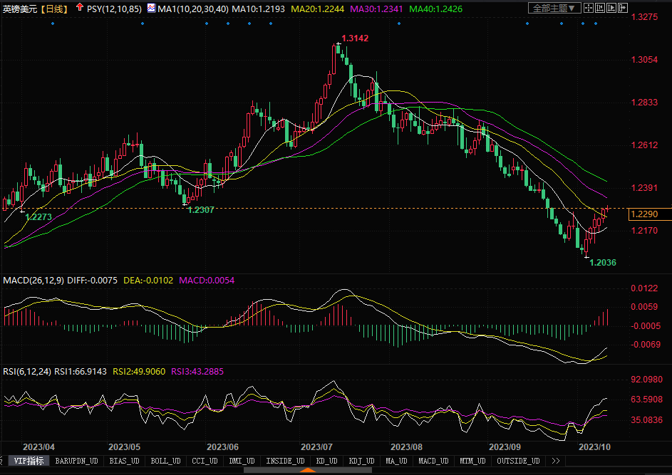 周二(10月10日),英镑兑美元上涨0.2%,报1.2265美元。英镑兑美元近几天走势有所起色,在9月创下一年来最差月度表现后,已连续五个交易日上涨。英镑兑美元最近上涨很大程度上要归功于美元。自上周五非农数据中的薪资增长项显缓,叠加本周初美联储重要官员陆续发表有关利率方面的鸽派言论,美元走势一直处于缓缓下落之中,这间接给到非美货币进行反弹整理的机会。日线图上,英镑/美元汇价开始穿越了布林带通道中轨线,技术指标MACD信号线形成金叉,RSI自超卖区域拐头上摆,显示英镑的多头交易有所聚拢。目前汇价已逼近上方强压力位置1.23附近,留意该阻力水平能否被突破。若能顶穿上述位置,镑美反弹回升路径将会变得明显。