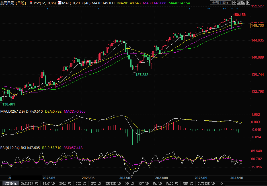 周二(10月9日),美元兑日元略回升0.15%,至148.68。周二美联储重要官员发表鸽派讲话,压低美债收益率,一度令日元产生升势,美元兑日元最低也曾去到148.15水平。但尾市未能守住涨势,在空头回补的拖动下,大幅缩减日间产生升幅。周二日间,日本共同社报道称,日本央行正在考虑上调今年的核心消费通胀预期。这不禁引起投资者对于日本央行有望结束负利率时代产生了遐想。尽管如此,在当前环境下,日元的走势更大程度上,还是要深受美债收益率随后走势变动情况的影响。若美联储停止本轮加息周期的事实逐渐明朗化,美债收益率开始出现持续下跌场景,那么长期以来压制日元表现的沉石将有望移除,日元或有望扭转近轮的颓势。近期留意148.00附近的支撑,若下破,美元/日元或有望形成一段回落的走势轨迹来。