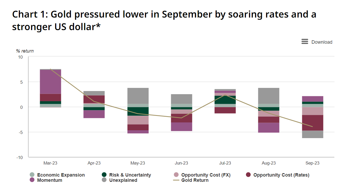 该报告将黄金月份充满挑战的原因归因于债券收益率大幅上涨以及美元走强。月底的抛售也可能是对美国经济数据的强烈不利反应、中国本地溢价下跌以及负面技术突破的结果。