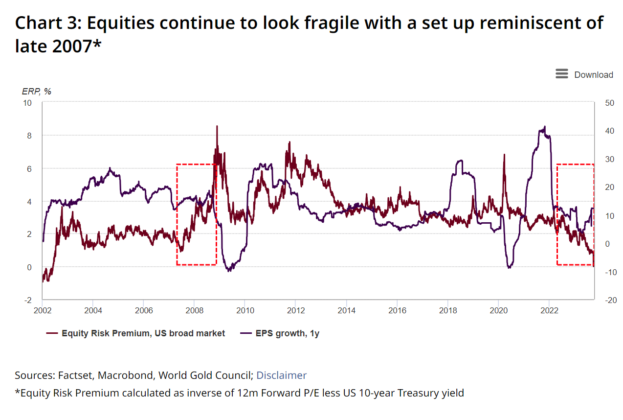 但黄金并不是债券收益率飙升的唯一受害者。较高的收益率正在压低股票风险溢价,而乐观的盈利增长预测让人想起 2007 年末的情况。收益率也进一步限制了金融状况,从某些指标来看,金融状况也与 2007 年类似。这反过来可能会加剧未来 6-12 个月的衰退风险。