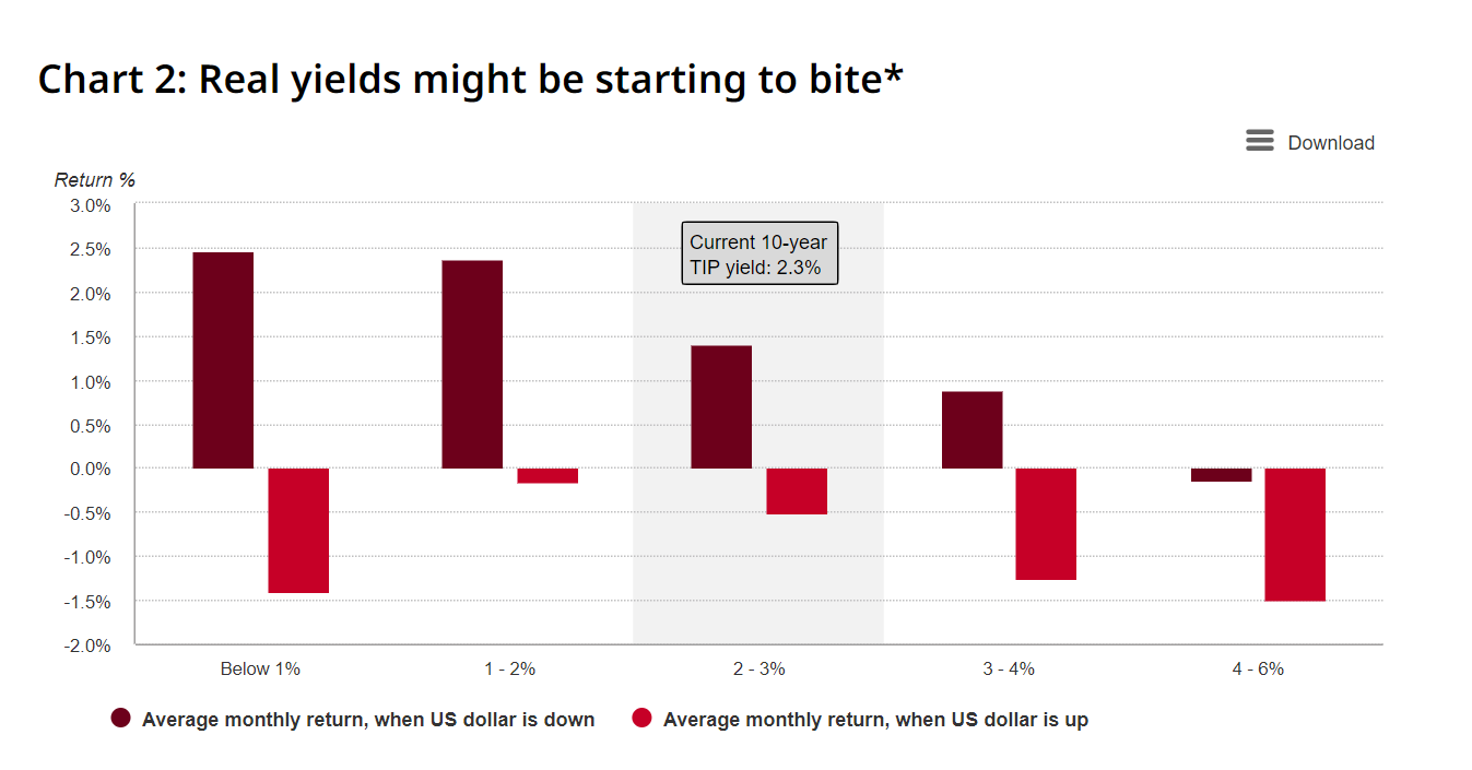 以美国国债为首的收益率正在上涨。历来与黄金密切相关的美国10年期TIPS收益率15年来首次突破2.3%。这一领域,加上美元的上涨3,此前已被证明对黄金构成挑战。