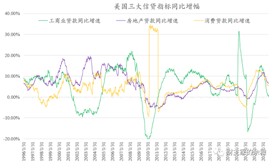 比方说,美国三大信贷指标中,对实体经济反应最灵敏的工商业信贷的增速指标,自2020年以来首次降为0,这意味着美国的工商业信贷规模(类似于中国的企业贷款),已经基本停滞,这是经济放缓尤为明显的一个领先指标。