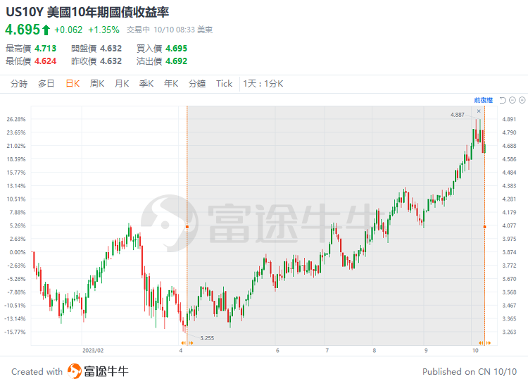 由于救银行释放的流动性,让美联储在3月底开始加速缩表。与此同时,10年期美债收益率触底上涨,由3.25%上涨至4.88%,半年的时间内涨超40%。