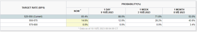 多名美联储官员们也于近日表示,长期利率的上升可能会取代美联储进一步加息。芝商所的美联储观察工具显示,截至10日,美联储下个月保持利率不变的可能性为85%,一周前该数值为71%。