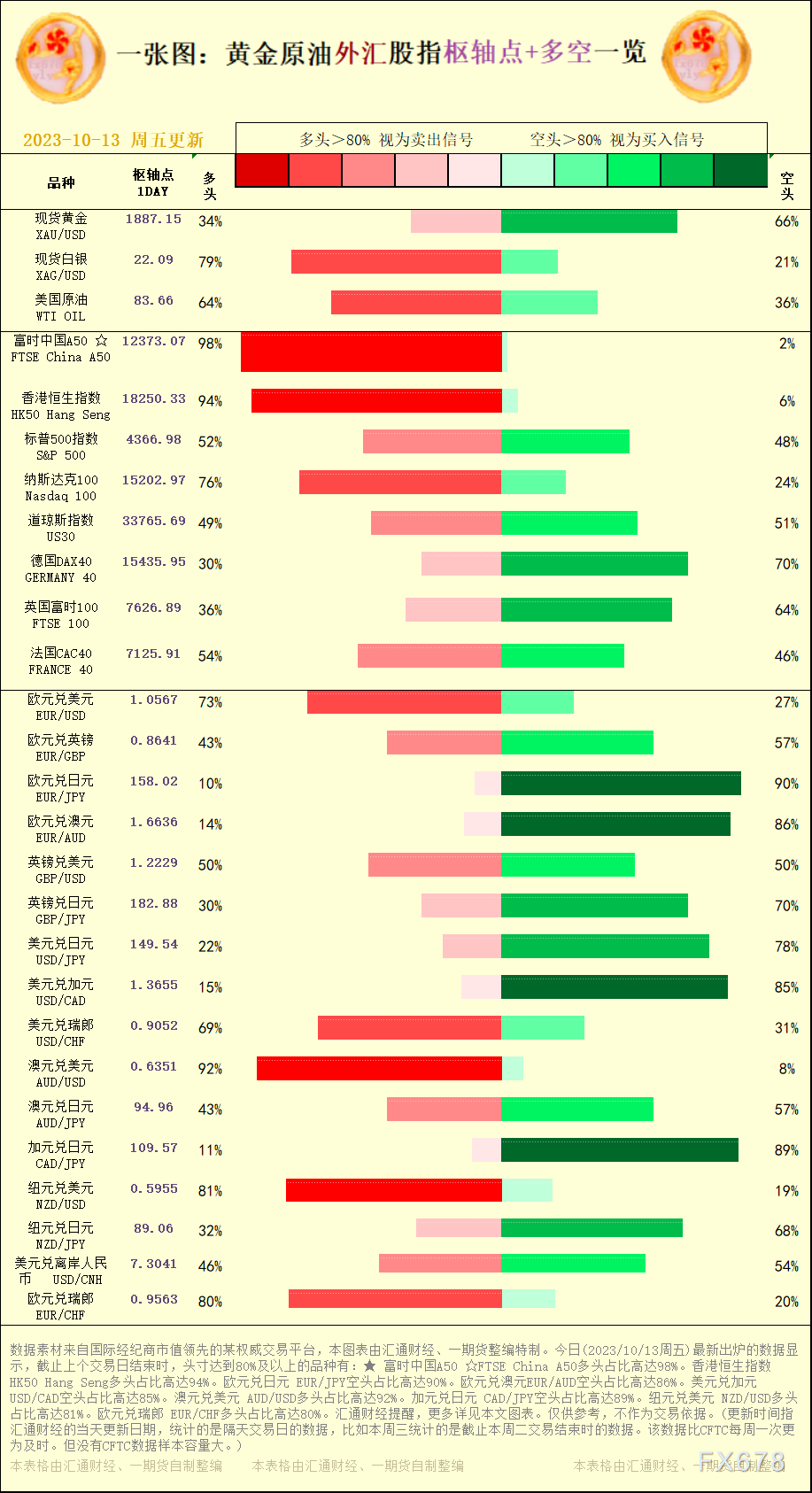 汇通财经APP讯——一张图:黄金原油外汇股指“枢纽点+多空占比”一览。今日(2023/10/13周五)最新出炉的数据显示,截止上个交易日结束时,头寸达到80%及以上的品种有:★ 富时中国A50 ☆FTSE China A50多头占比高达98%。香港恒生指数 HK50 Hang Seng多头占比高达94%。欧元兑日元 EUR/JPY空头占比高达90%。欧元兑澳元EUR/AUD空头占比高达86%。美元兑加元 USD/CAD空头占比高达85%。澳元兑美元 AUD/USD多头占比高达92%。加元兑日元 CAD/JPY空头占比高达89%。纽元兑美元 NZD/USD多头占比高达81%。欧元兑瑞郎 EUR/CHF多头占比高达80%。汇通财经提醒,更多详见本文图表。仅供参考,不作为交易依据。