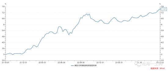 譬如,美国30年期抵押贷款固定利率持续攀升至7.57%,愿意以这个利率贷款的人要足够看好美国的地产市场。一旦投资者们对地产市场的预期转弱,这块市场所派生的存款将出现问题。