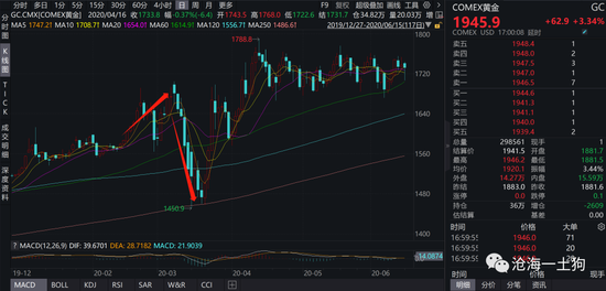 如下图所示,2020年2月至3月,欧美疫情形势加速恶化,美元黄金表现为先涨后跌。