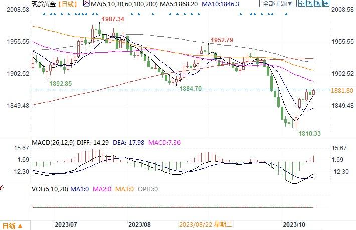 美国劳工统计局周四公布的数据显示,9月消费者物价同比增长3.7%,与8月相同,高于华尔街经济学家预测的3.6%。剔除食品和能源的核心消费者价格指数(CPI)上月增长0.3%。受能源价格上涨提振,整体CPI升幅0.4%,高于预期水平。经济学家认为核心CPI是衡量潜在通胀的更好指标。这两个数据都高于美联储2%的年通胀目标。有机构的首席经济学家表示,“通胀数据将使美联储对再次加息持开放态度,不过不可否认市场最终可能会为他们完成收紧货币的任务”。尽管近期美联储官员近就债券市场的期限溢价和美元疲软发表鸽派评论,然而粘性的通胀压力重新点燃了美国国债收益率的看涨势头,为美元整体的强劲反弹铺平了道路。周四当天的通胀数还导致交易员重新定价美联储的最终利率,将 12 月FOMC会议加息 25 个基点的可能性从一天前的 26% 提高到 36%。为此,美国债券收益率创下7月27日以来的最高单日涨幅。以10年期美国国债为基准的收益率达到4.708%,当日上涨2.46%。美国通胀连续第三个月高于预期,给出的信号表明,即使官员们屡次强调保持耐心的重要性,美联储应该还是会保留年内加息一次的可能性,这或仍会对黄金在短时间内构成压制。但从周四的收盘情况来看,黄金似乎受到的冲击并未如想象中之大,金价仍紧紧粘在1870美元近期高价位区域,显示黄金多头仍在坚持不愿撤出阵地。