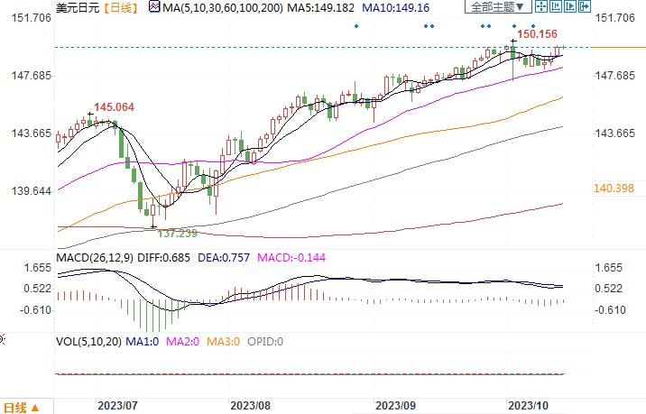 周四(10月12日),美元/日元尾盘上升0.43%,报149.81,再度逼近150警戒关口。美元近期表现疲软是受公债收益率下降推动,因为美联储对未来加息的立场有所缓和,推动公债价格反弹。而周四略比预期超强的通胀数据,使指标10年期公债收益率当天上升10.6个基点,至4.7032%,上周触及2007年以来最高4.887%。美债收益率继续维持在高水平,无疑也就继续压制着日元。只是来到了警戒线水平之时,由于担心日本央行的干预,美元/日元至今未敢越过雷池。继续留意警戒水平150的阻力强度,若穿越,则有可能开启一段新的升势。若继续受阻上述水平,则美元/日元回落调整走势或有望出现。