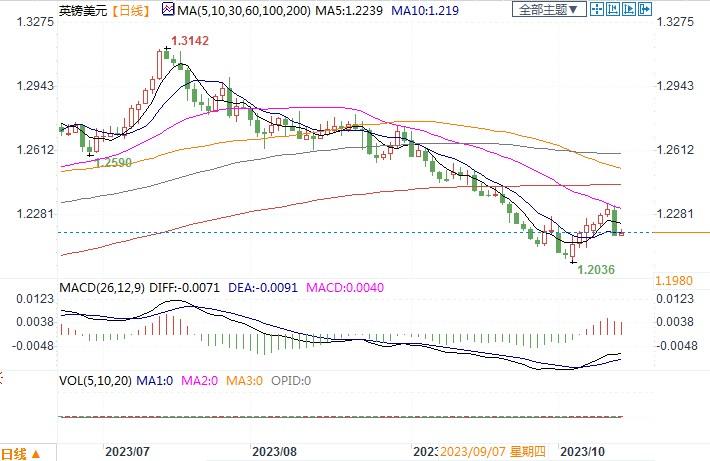 周四(10月12日),收超过预期的美国通胀数据影响,英镑/美元下跌1.15%至1.2174。周四当天英国公布的数据显示,英国经济在经历了7月的大幅下滑后于8月份实现了部分复苏,但在经历了去年的通胀飙升和英国央行连续14次加息之后,经济总体情况仍然是增长乏力。数据强化了一种说法,即英国正在陷入停滞而非衰退,这也同时似乎在证明,英国的利率继续调升空间微乎其微了。叠加当天美元受通胀数据刺激抬捧回升的影响,近期本就显脆弱的英镑转而大幅回落。日线图上,英镑/美元再度回落到布林带中轨线之下,若后续收盘无法回升至1.2250之上,则小心防范英镑/美元继续向下滑落运行于此前形成的下降通道之中。