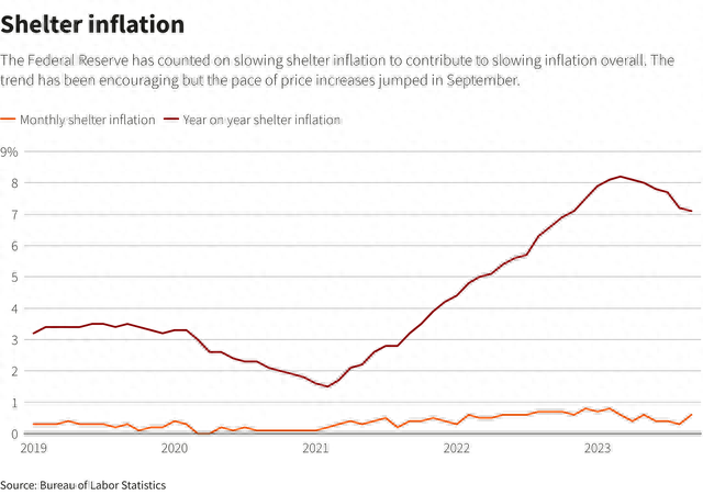 住房成本数据足以影响消费者价格指数(CPI)的放缓进程,而美联储官员还需要看到该数据回落,才有可能继续朝着2%的通胀目标迈进。核心CPI从8月份的4.3%降至上个月的4.1%,同比有所放缓,但住房成本环比涨幅翻了一番,从8月份的0.3%升至0.6%。