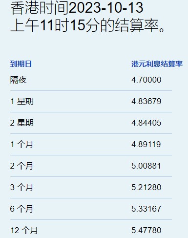 10月13日,港元拆息普遍走低,与楼按相关的一个月拆息连跌两天,报4.89119%,续创一个月新低。隔夜息结束三连跌,略为回升至4.7%,反映银行资金成本的三个月拆息微升至5.2128%,与同期美元LIBOR息差收窄至44基点。长息方面,六个期及一年期拆息分别回落至5.33167%及5.4778%。港元汇价今早在7.8217-7.8243之间上落,最新报7.8221,较上日收市价升0.02%。