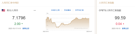 10月17日,人民币中间价报7.1796,上调2点,上一交易日中间价报7.1798。